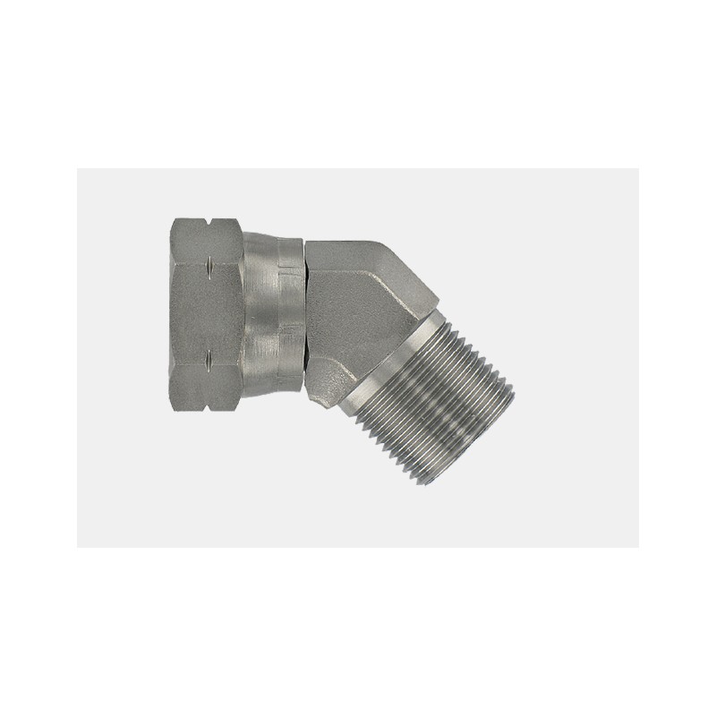 Cot 45° BSP FI–FE cu piuliță orientabilă din oțel , cu con de 60°. Recomandat pentru realizarea conexiunilor hidraulice la un unghi de 45°, oferind fiabilitate și durabilitate în exploatare.