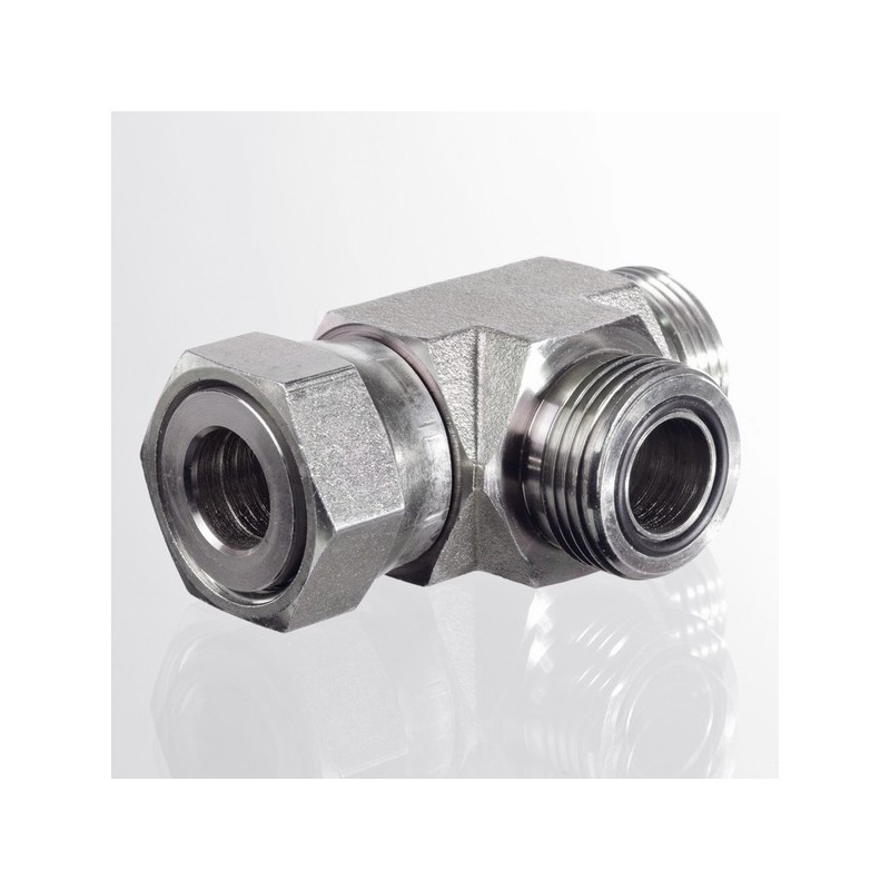 Teu ORFS egal cu filete exterioare și piuliță orientabilă laterală, etanșare dreaptă pentru conexiuni hidraulice..